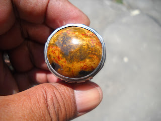 fossil kayu ikat monel, warna kombinasi hitam, kuning dan merah.Jika diamati terdapat lingkaran tahun mulai dari tengah batu. Ikat monel lawasan halus, dimensi 27 x 26 mm.  (SOLD)