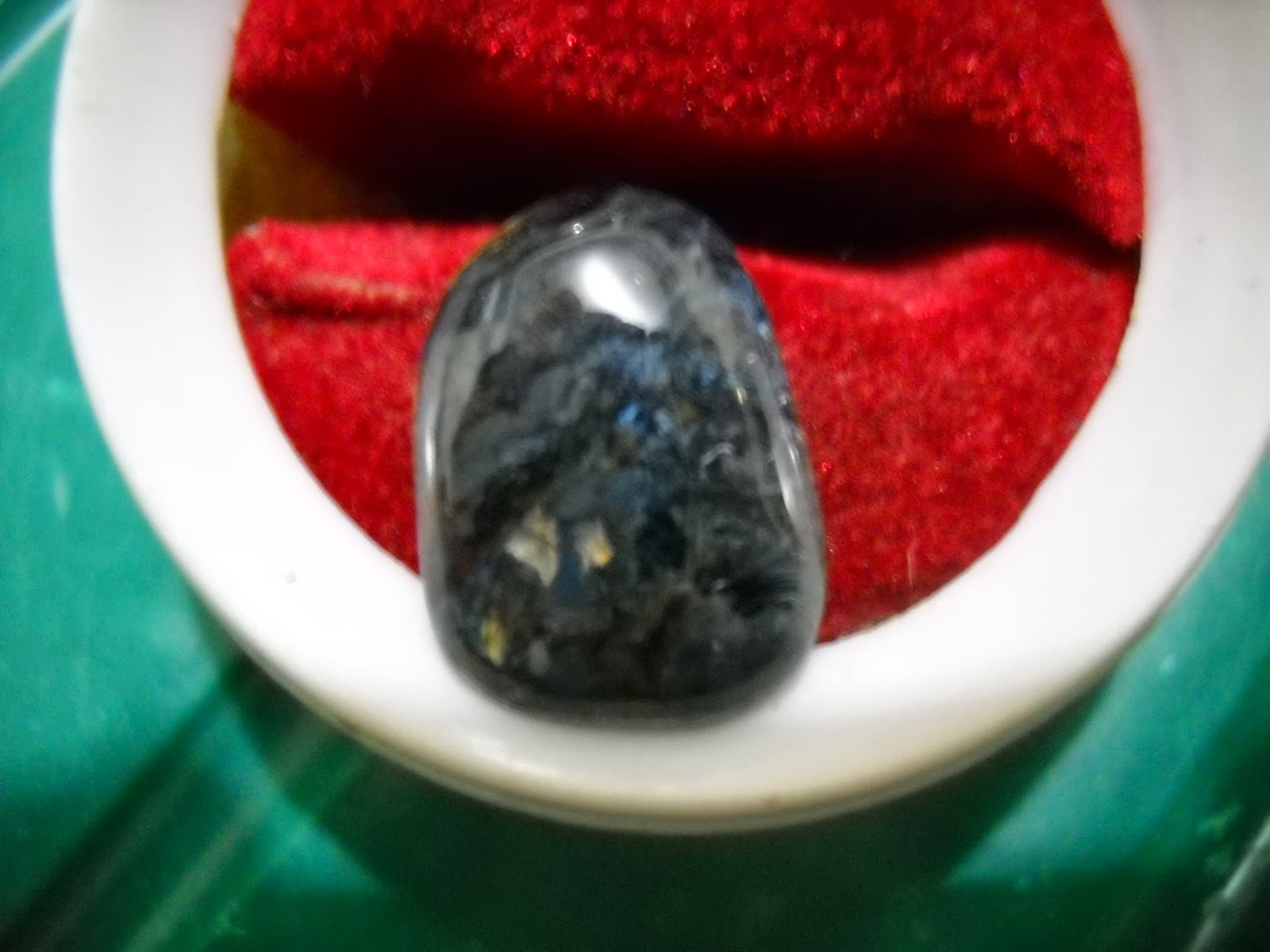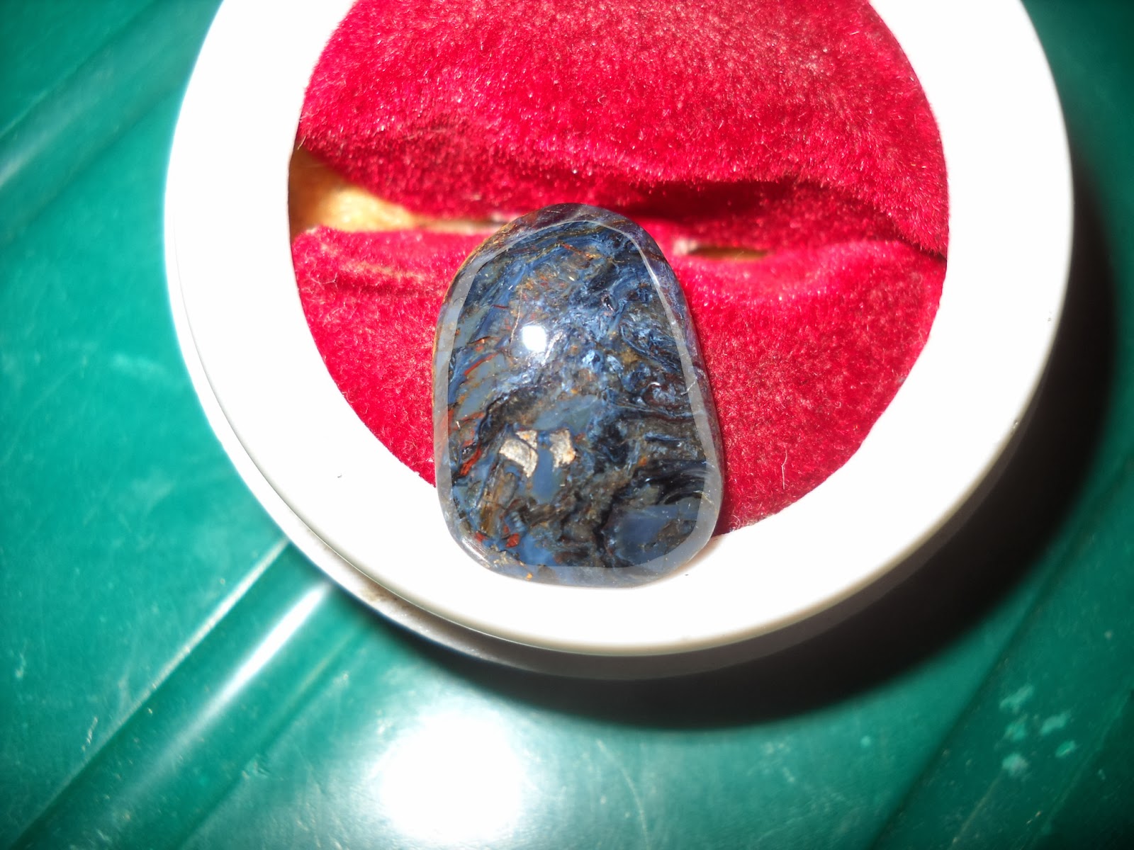 pietersite biru (gambar bawah dengan lampu blitz), dimensi 12 x 20 mm. (SOLD)